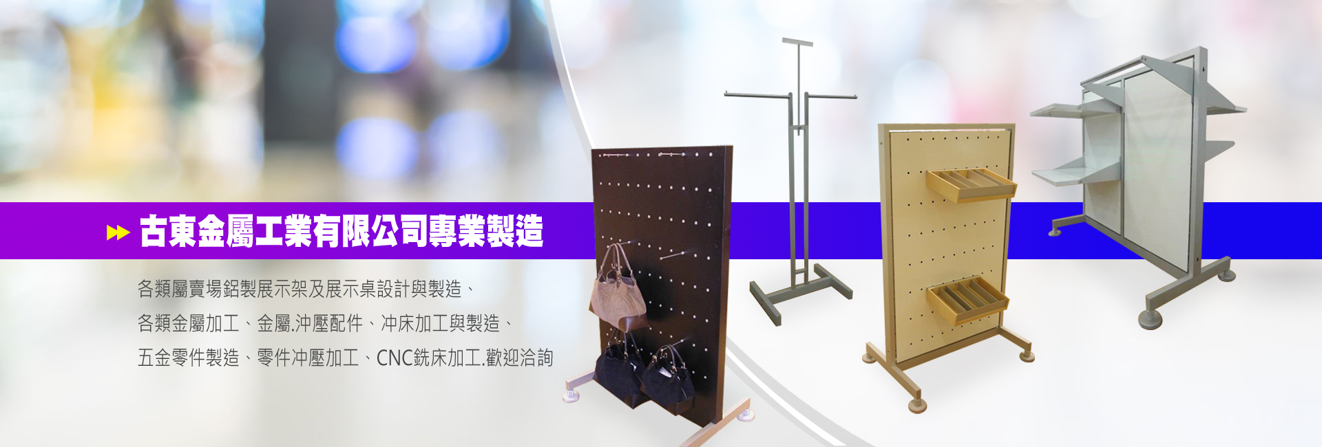 古东金属工业有限公司成立于1998年4月,主要从事各类展示架及展示桌设计与制造、各类金属加工、零件冲压加工、CNC铣床加工,从产品原料加工、生产、包装到出货等一贯化作业,目前产品主要销售澳洲、纽西兰、新加坡、马来西亚、东南亚、中东等地区。古东秉持着顾客至上理念,坚持产品品质,以满足客户之需求。